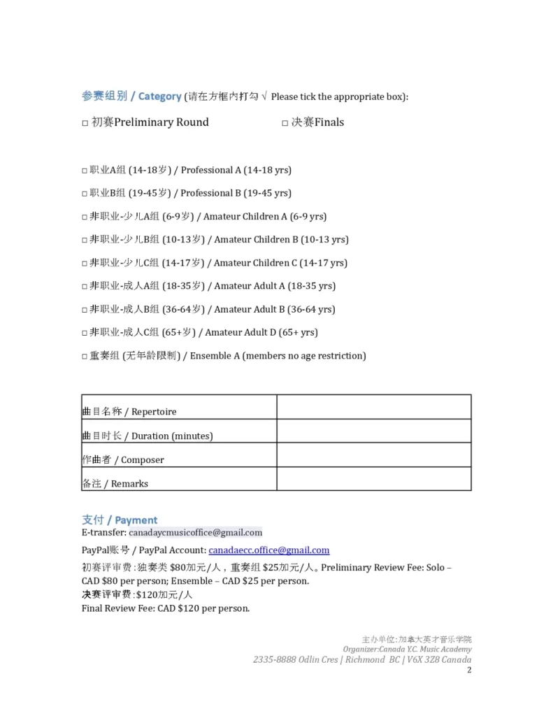 3. Preliminary review fee: Solo category – CAD $80 per person; Ensemble category – CAD $25 per person.