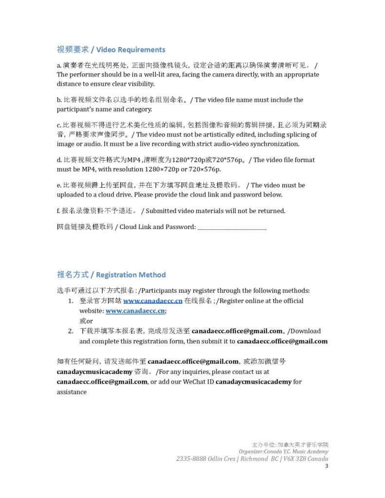 5. Around December 15, 2025, the preliminary results will be published on the WeChat public account “Canada Y.C. Music Exchange” and the official event website www.canadaecc.cn.